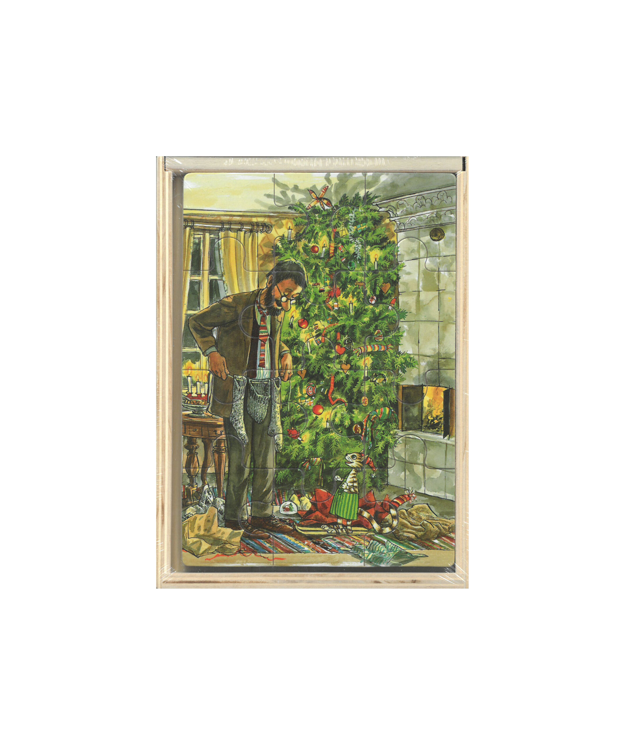 Puslespil i træ. Trææske med 4 forskellige puslespil. Illustreret af Sven Nordqvist.