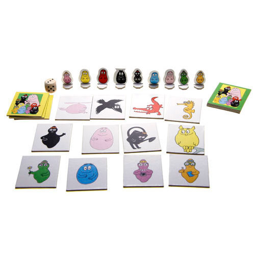 Terningespil. For 2-9 spillere. Indeholder 1 spilleplade, 9 spillebrikker, 18 kort og 1 terning. Danske regler. Illustreret af Annette Tison & Talus Taylor.